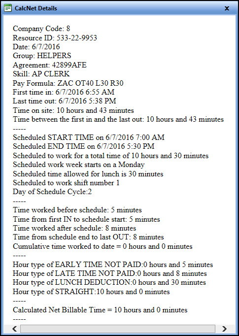 The Calc Net Details dialog box is used primarily to check the functionality of a pay formula.